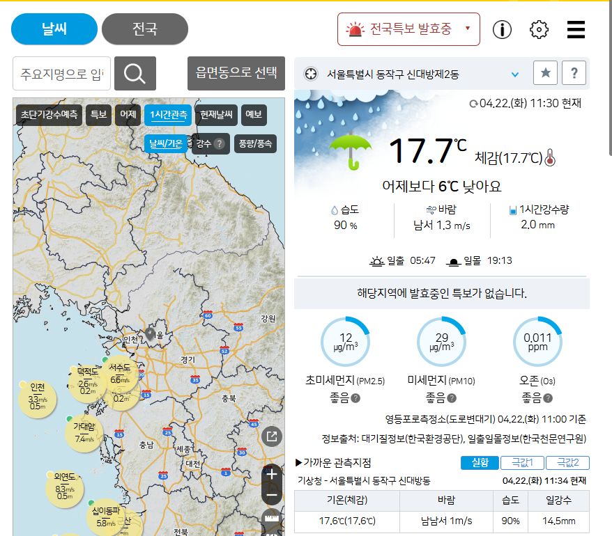 동네예보 메뉴를 이용하시면, 시·군·구 단위로 1시간 간격의 상세한 날씨 예보를 확인할 수 있어요. 여기에 관측자료까지 함께 본다면 실시간으로 비교 확인도 가능하답니다.