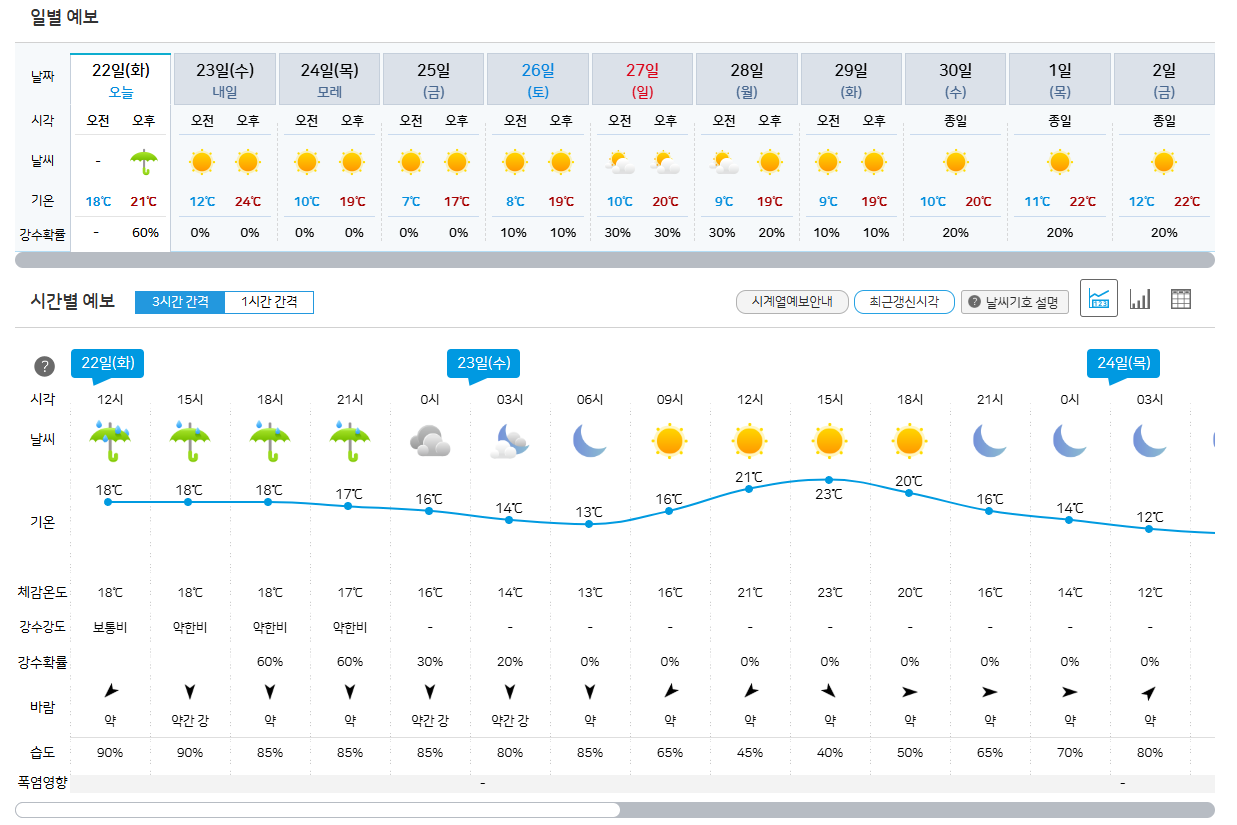 - 동네예보 – 우리 동네 시간대별 기온, 강수량, 습도 등