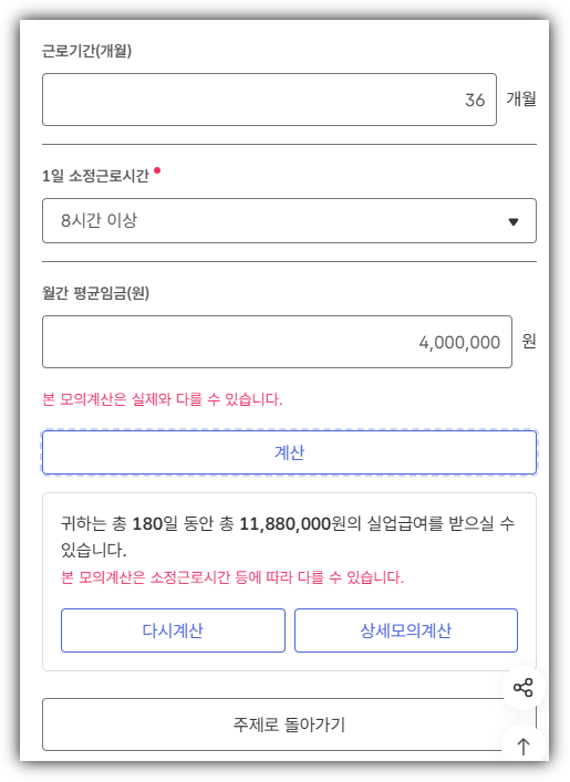 정확한 금액을 알고 싶다면, 고용노동부에서 제공하는 실업급여 모의계산기를 활용하면 돼요. 별도 앱 설치 없이 웹에서 바로 이용 가능하니까 금방 확인할 수 있어요.