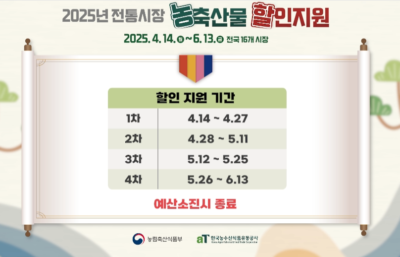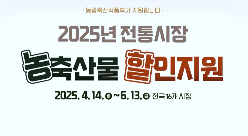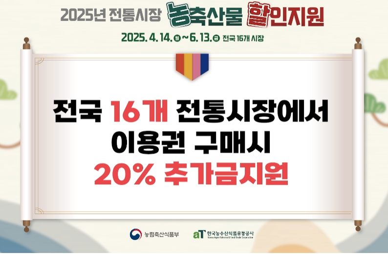 2025년 4월 14일부터 6월 13일까지, **전국 16개 전통시장**에서 국산 농축산물 구매 시 20% 할인을 받을 수 있는 정부 시범사업이 진행돼요.