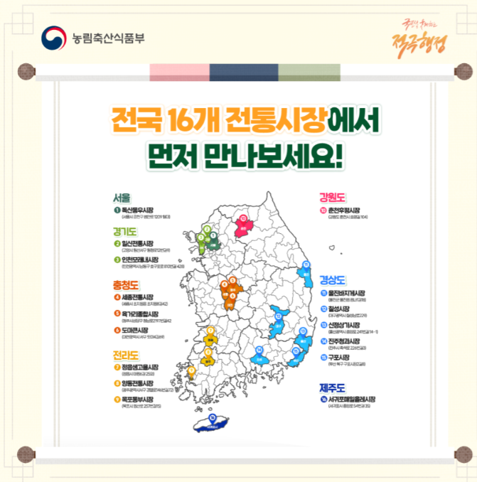 2025년 전통시장 농축산물 할인 시범사업은 아래 전국 16개 전통시장에서 운영됩니다.