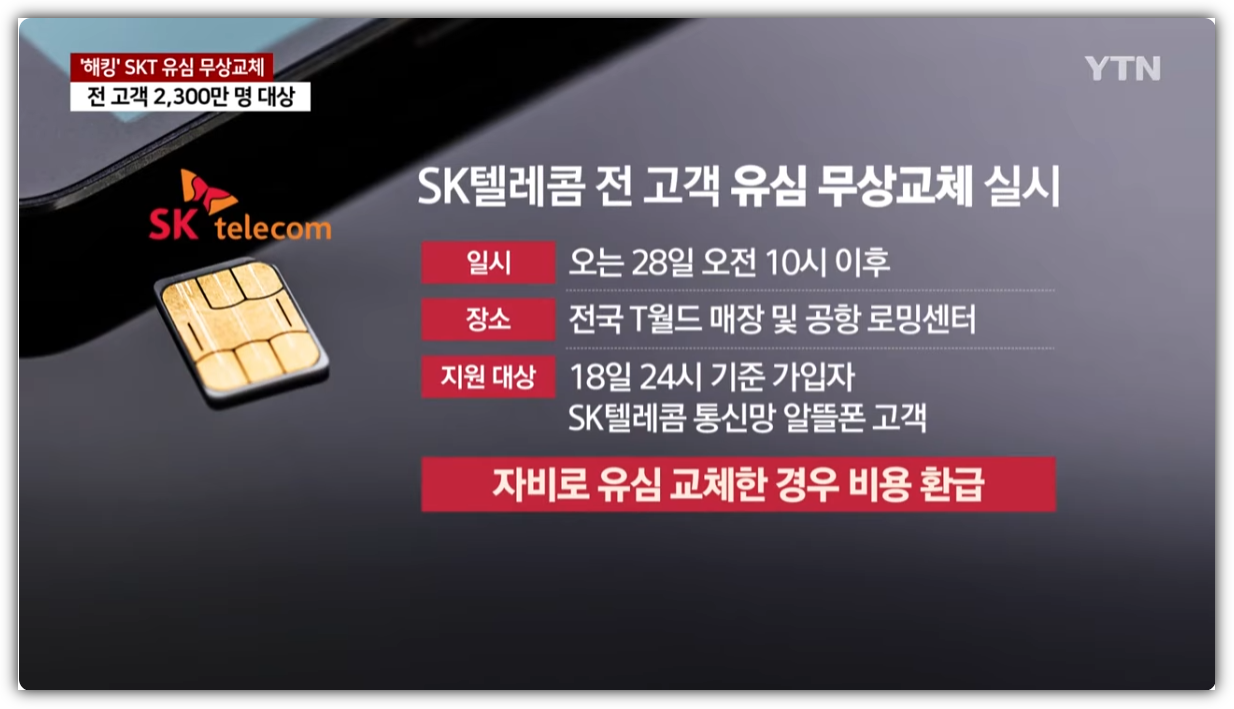 사고 직후 SK텔레콤은 모든 고객을 대상으로 **유심 무상 교체를 제공**하겠다고 밝혔어요. 유심을 이미 자비로 교체한 고객이라면, 비용 환급도 받을 수 있고요. 유심 무료 교체 대상과 일정은 아래와 같습니다.